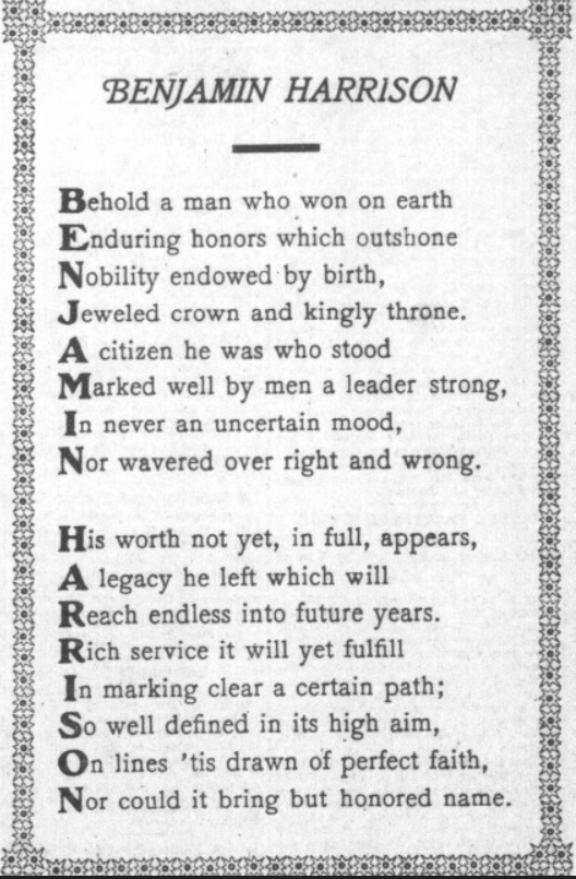 News of Benjamin Harrison’s illness began to spread across the country. The Saturday morning headline of the New York Times read, “Gen. Harrison Very Ill.” As told by Ray Boomhower in this thorough Twitter thread, upon learning of the general’s condition, many concerned citizens wrote to the Harrison family with homemade cures. From eating as many tomatoes as possible to running hot water up his nose, many Americans showed compassion and concern for their former Commander in Chief.