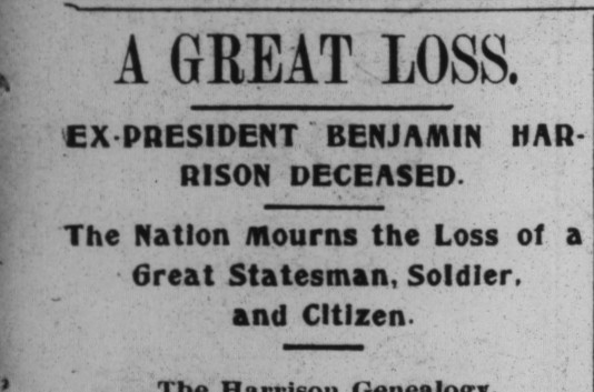 With his wife holding tightly to his right hand and Dr. Jameson his left, Benjamin Harrison’s pulse grew weaker and his breathing more shallow. At 4:45 pm, Dr. Jameson felt for a pulse one last time. Upon finding none, he put his ears to the President’s chest. As expected, he heard nothing. An eerie silence and absence of life that can only mean one thing. “General Harrison is dead.’ Dr. Jameson announced to the room. Rev Haines said a brief prayer, and Mrs. Harrison began to weep. When later recounting the scene to the press, Col. Ransdell, who served alongside General Harrison in the Civil War said, “It was a most affecting scene, to see that great man lying there, his life ebbing away, and no power on earth to hold it back.”